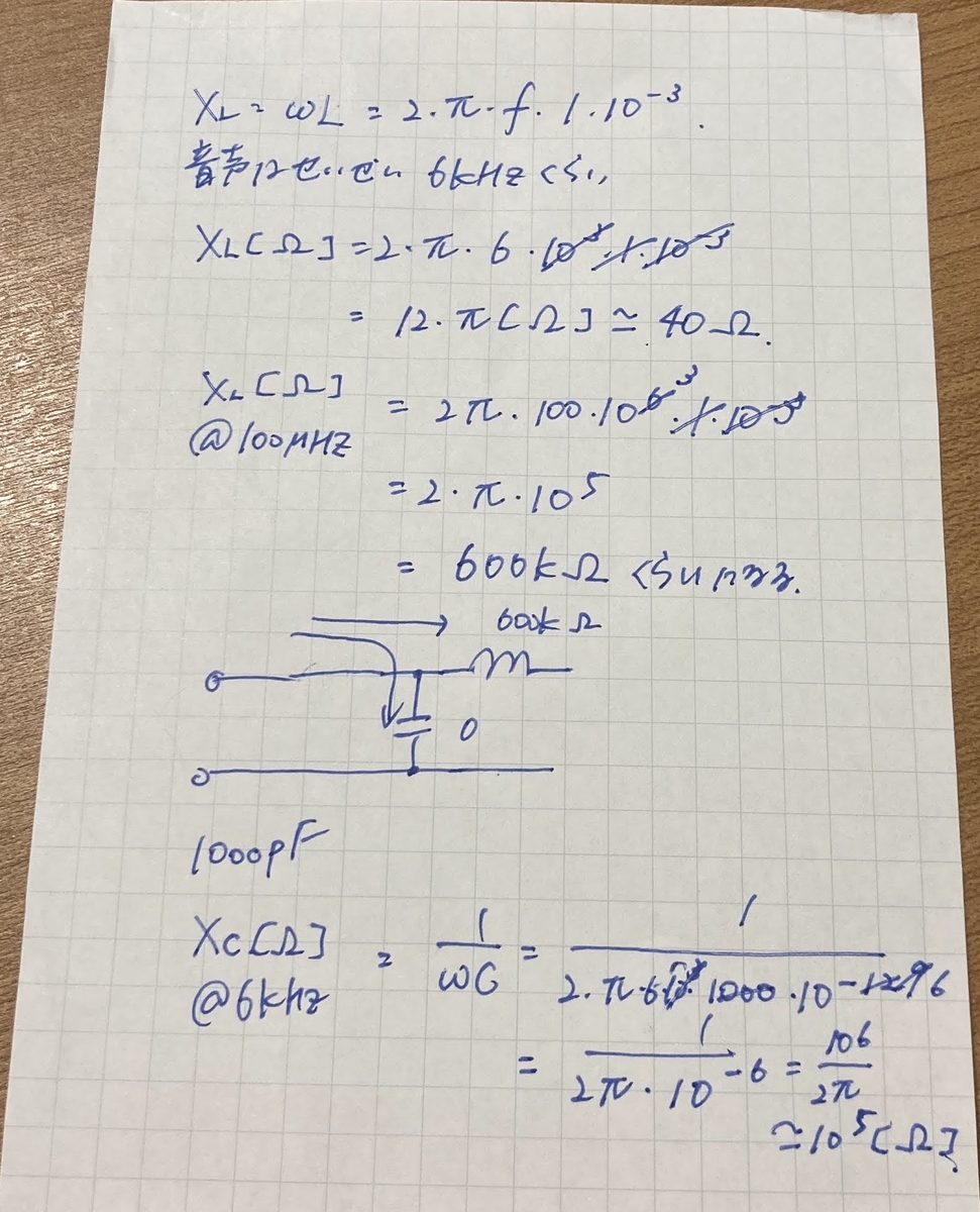 一応計算してみたところ、LPF 側に流れ込む 100MHz の高周波に対するインピーダンスは 600kΩ で、HPF側に流れ込む 6kHz の可聴周波に対するインピーダンスは 100kΩ くらいになるようだ。これくらいあれば相互に影響するというのはない…と信じる。
